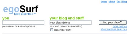EgoSurf mide tu ego en forma de “ego points”. Para ello utiliza como herramienta principal Google y te da la puntuación. EgoSurf es ideal para los egocéntrico's o los que quieren conocer un poco más sobre su popularidad en Internet. Para ello, realiza un análisis de cuántos son los sitios que tienen a tu nombre y tu blog como referencia, convirtiendo el resultado en egopoints o puntos de ego.