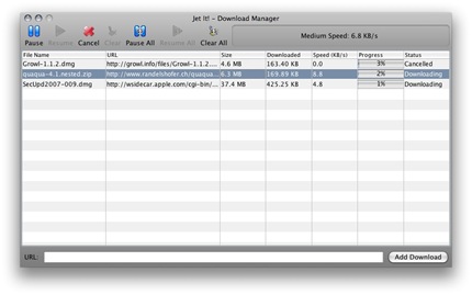 Jet It es un gestor de descargas gratuito que mejora el control de las mismas, especialmente si dispones de una conexión lenta. Está en Java y es compatible con Leopard, con un interfaz integrado con el nuevo Mac OS. Sólo permite descargas HTTP, aunque anuncian la próxima compatibilidad con FTP y tiene multitud de funciones configurables. Algunas de las características de este gestor es : Soporte para Mac OS X Leopard, Las descargas se inicializan automáticamente, Posibilidad de parar y reanudar las descargas, Descargas HTTP entre otras más .