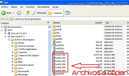 1.- Tienes que tener acceso a otra computadora que no sea la tuya pero que tenga instalado el NOD32 , y que esta si tenga la conexión a Internet y ver que este actualizado, en esta computadora vamos a la siguiente ruta C:\Archivos de programa\Eset