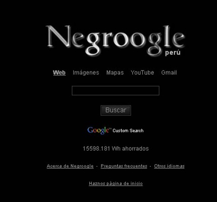 Negroogle es un interesante motor de búsquedas que intenta aunar el esfuerzo de salvaguardar el consumo de energía y las emisiones de CO2 a la atmósfera, ofrece las búsquedas en español de Google y a la vez te permite ahorrar energía, ya se calculó hace unos meses que el ahorro sería de unos nada despreciables 3000 MWatt/h cada año.