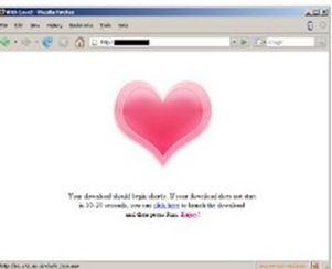Storm Love envía un mensaje de spam, que incluye un asunto relacionado con el amor y la festividad de San Valentín y, en el cuerpo del mensaje, aparece un enlace web HTTP. Cuando el usuario hace clic en el enlace que aparece en el correo electrónico es dirigido a una web como la de la imagen, desde la que supuestamente se va a realizar una descarga. Si el usuario realiza la descarga su sistema se infectaría con Storm.
