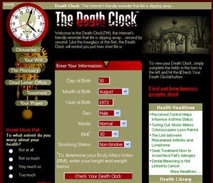 Deathclock es una página web para aquéllos que siempre están pensando en que día morirán o algo por el estilo. En esta web ingresas tus datos como fecha de nacimiento, el sexo, la personalidad ( si eres positivo, negativo ) el índice de masa corporal y si eres fumador, luego de ingresar estos datos te aparece una ventana emergente en donde te mostrarán en cuenta regresiva el día de tu final.