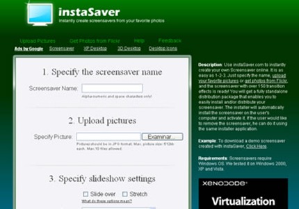InstaSaver es una herramienta web que nos permite crear el nuestro salvapantallas con nuestras propias imágenes que podemos subir desde nuestro escritorio o desde nuestra cuenta de Flickr, especificar como queremos que se muestre y listo. Al final se nos proporcionará un enlace para descargar el archivo ejecutable que instalará nuestro protector de pantalla, el cual también servirá para desinstalar en caso de que así lo deseemos. Es compatible con Windows Vista.
