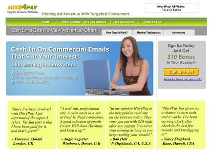 Hits4pay este es un sitio que paga por leer e-mails, en realidad esto es lo mismo que los sitios que pagan por click, lo único diferente es que en vez de tener que entrar como usuario registrado a su sitio web. Hits4pay te envía los avisos por e-mail, al registrarte gratuitamente, te dan un bono de U$10.00, además recibirás 2 centavos por cada email que recibes personalmente y si logras inscribir a otras personas con tu referencia te acreditarán 1 centavo por cada email enviado a ellos. El monto mínimo de pago es de U$25, y los pagos los hacen a través de PayPal.