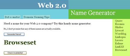 Name Generator es un servicio online que te brinda un nombre de dominio para tu sitio web. Si generas un nombre y no te gusta, esta aplicación te da la facilidad de generar tantos nombres de dominios como quieras por que todos se irán situando en la barra lateral derecha para disponer de ellos en cualquier momento. También puedes saber si ese nombre que deseas esta disponible.
