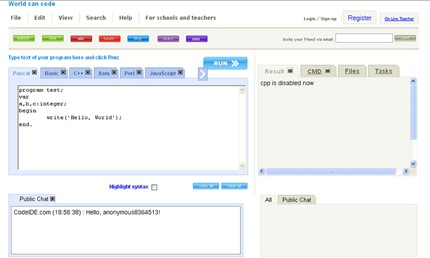 CodeIDE es un aplicación web desarrollada sobre AJAX que nos permite programar en lenguajes como Basic, Pascal, C++, JavaScript y MATH en línea. Con la posibilidad de ejecutarlos luego y generar un ejecutable, Al igual que cualquier IDE de programación, CodeIDE ofrece la posibilidad de resaltar la sintaxis del código y enumerar las líneas de código. Como elemento extra, CodeIDE nos da la posibilidad de solicitar ayuda a un profesor online en caso de necesitarla.