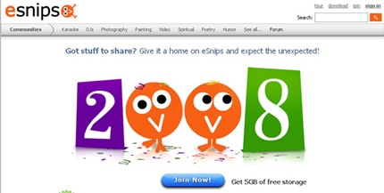 Esnips es una página web que ofrece 5 GB de almacenamiento a sus usuarios, también ofrece la posibilidad de compartirlos, descargar cualquier imagen, vídeo, texto o aquéllos que hayas visto por Internet y te gustaría guardar.