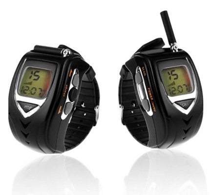 Los Walkie Talkie Watches son dos relojes que tienen las funciones básicas de cualquier reloj, incluyen una antena para la recepción de las ondas de radio, incorpora funciones de comunicación de 22 canales (en EEUU) y 8 canales en Europa. Su pantalla retroiluminada de 3 líneas muestra la información del canal seleccionado, el volumen, y la hora. Este dispositivo tiene un buen alcance de un kilómetro, lleva una batería de Ion-Litio de 3,7 voltios, y sus dimensiones son 17 x 11,5 x 7 centímetros.