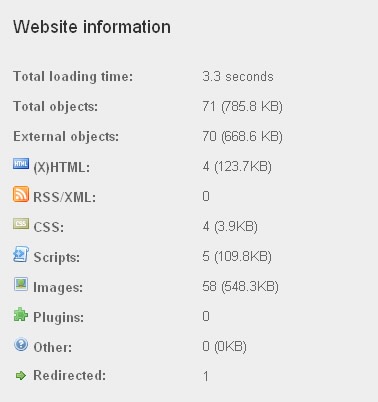 Y más abajo, un resumen con el tiempo total de carga de todo tu sitio web, el total de obejtos, el peso y tiempo de ejecución de tus scritps, plugins, etc.