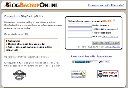 BlogBackupOnline es un sitio web que brinda en forma gratuita el servicio de hacer copia de seguridad de todas las entradas y comentarios de nuestro blog, permite descargar el contenido de la copia de seguridad a nuestra computadora en un archivo XML y tiene una capacidad de 50 MB de almacenamiento. Lo que tienes que hacer es registrarte e ingresar los datos de tu blog, y listo.