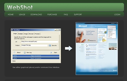 WebShot es una aplicación gratuita que te permite capturar en imágenes una página web. El procedimiento es muy sencillo, solo tenemos que indicarle la dirección URL que deseamos transformar a imagen, escogemos las dimensiones de salida de la imagen así como también la calidad de ésta (el formato de salida puede ser JPG, GIF, PNG o BMP) y eso es todo.