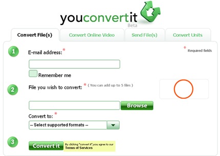 Youconvertit es un servicio online que es capaz de convertir los formatos de tus archivos a otro que tú desees sin importar la extensión ya que esta herramienta es muy completa. Lo que tenemos que hacer es escribir nuestro e-mail para que luego nos envíen el enlace para la descarga y luego agregamos los archivos que queremos convertir y elegimos a qué formato queremos convertirlos. También podemos convertir y descargar videos, estos pueden ser directamente videos de Youtube, Google Video o Metacafe y convertirlos a formato 3GP, AVI, MOV, MPEG, entre otros y extraer sólo el audio en MP3.
