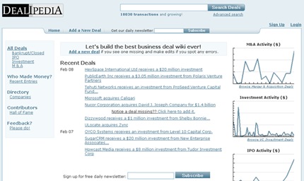 Dealipedia es un sitio web que tiene en su contenido un compendio de noticias, información y un poco de rumores sobre acuerdos empresariales, es decir una especie de Wikipedia de de los negocios. El formato de la web es el wiki, de modo que cualquier usuario registrado puede anotar un nuevo acuerdo o noticia empresarial.