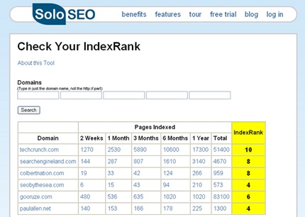 Indexrank es una herramienta web que te permite medir la cantidad de páginas de cada sitio indexadas por Google, con esta herramienta podemos ingresar los nombres de dominio de nuestros sitios y el de alguna web de referencia que por lo general será algún sitio web al cual queremos superar y así hacer los ajustes necesarios para tratar de superarnos.