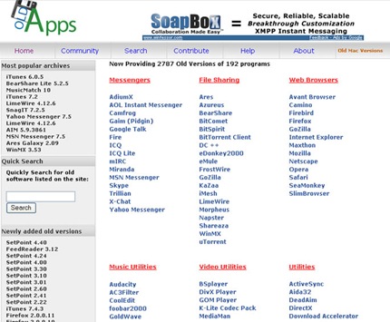 Oldapps es un sitio web en donde encontrarás muchas versiones antiguas de varias aplicaciones gratuitas conocidas. Éstas se encuentran clasificadas por categorías como mensajería instantánea, programas de intercambios de archivos, navegadores web, reproductores de audio y video, entre otros más.
