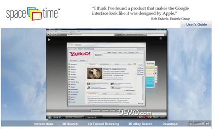 Spacetime es un navegador de Internet en 3 dimensiones que presenta un bonito efecto animado al pasar de una ventana a otra. Con esto dejamos atrás el navegar en 2 dimensiones, este aspecto tridimensional te permite observar de un solo vistazo varias pestañas, resultados de búsqueda o ventanas, haciendo realmente más agradable la navegación. Lo interesante de esta herramienta es que no requiere instalación, simplemente descargar y ejecutar.