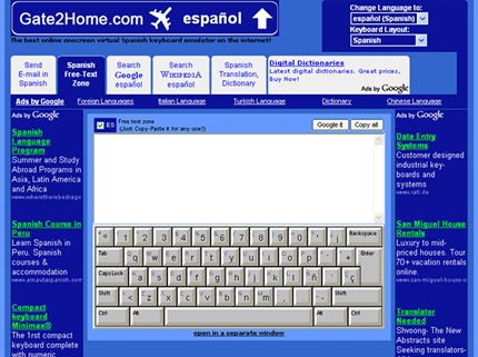 Gate2home es un sitio web que te brinda un teclado virtual, el cual te permite escribir usando el teclado del idioma que quieras sin tener que cambiar nada y estés donde estés. Es muy eficiente sobre todo para aquéllos que utilizan Linux y no tienen configurado el teclado o para los que sufrimos a veces por descubrir dónde está cierto caracter como "|", "º", "&", y no recordamos el código ASCII del mismo.