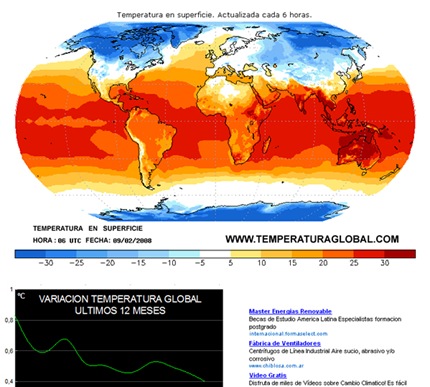 El calentamiento global hoy en día es un tema muy discutido por muchos, como se sabe la temperatura del planeta ha venido elevándose desde mediados del siglo XIX, en si el calentamiento global es la medida de la temperatura de la atmósfera terrestre y de los océanos en las últimas décadas. Para los que tienen curiosidad sobre este tema, existe una web que mide el calentamiento global cada 6 horas, la página se llama