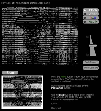 Krazydad es un sitio web donde podrás tener las imágenes de tu web cam transformadas a código Ascii. Lo bueno de esto es que la transformación es online y la aplicación detecta tu web cam automáticamente y apartir de ello se genera estas imágenes pero en código Ascii listas para copiar y pegar en donde desees ya sea en tu Hi5, MySpace, MSN, etc.