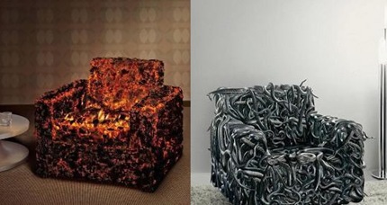 Por ejemplo, este par de sofá unipersonal de brasa o carbon al rojo vivo, o el de la derecha, hecho a base de vívoras super venenosas.